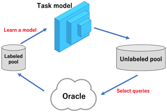 As shown in Figure 1, active learning selects the most useful images from the unlabeled images for model learning, then labels the selected images using Oracle (annotater), and finally adds the labeled images to the labeled pool to update the task model for learning. This process is repeated until the performance of the task model meets the requirements or the budget is exhausted. Active learning is widely used in image classification [7,8,9], which is the task of categorizing objects in an image, and segmentation [10,11], which is the task of classifying each pixel in an image according to the object to which that pixel belongs.