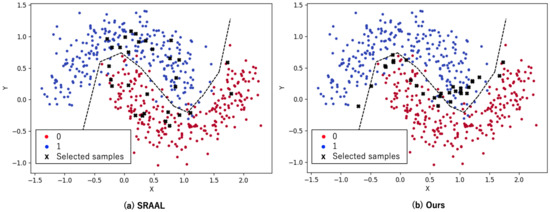 Visual results of active learning methods (SRAAL [13], our UIG) on a toy example. The red points represent classes with 0, and blue points with 1. The black faction marks are the samples selected by each method. The oracle decision boundary is shown as a black dashed line. We trained on 500 samples and selected 30 samples from the 500 unlabeled samples. It can be seen that the proposed method is able to select samples near the decision boundary better than SRAAL. Reprinted/adapted with permission from Ref. [21]. 2007–2021, the scikit-learn developers.