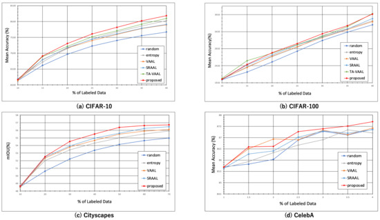 The experiments were each conducted five times, and the results of the experiments were averaged to determine the final value. The evaluation metrics used were accuracy for the classification tasks and mean intersection over union (mIOU) for the semantic segmentation task. Since the purpose of active learning is to improve the efficiency of annotation in normal learning, commonly used metrics were selected for each evaluation metric.