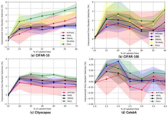 Figure 5a shows the improvement from the random sampling baseline for each method with standard deviation (shaded). The proposed method outperformed others on CIFAR-10 in all stages.
