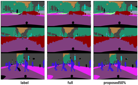 Table 2 shows a comparison of the average IOUs for each class obtained by random sampling and the proposed method; each sampling was performed five times with 50% sampling. Table 3 shows the average, minimum, and maximum values of IOUs for each class in random sampling.