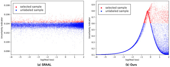 Figure 7 shows a graph of the actual losses of SRAAL and the proposed method on the x-axis and the uncertainty index of each method on the y-axis in CIFAR-10. The point chosen for the 5% selection after training with the randomly chosen 10% is shown in red. Note that both SRAAL and the proposed method select data points with the highest uncertainty index for unlabeled data. In this figure, it is ideal to be able to sample the points on the right (where the real losses are higher). SRAAL selects images with a wide range of actual losses, as shown in Figure 7a, whereas our proposed method can select images with relatively high real loss values, as shown in Figure 7b. Furthermore, the correlation coefficient of the proposed method is 0.43, compared to 0.01 in SRAAL. From the above, it appears that the proposed method performs better than SRAAL on a variety of tasks.