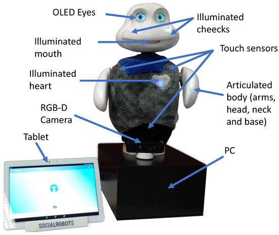 40]. Mini was developed at RoboticsLab and is a desktop robot that is 59 cm tall and can share its emotional state through expressive eyes, an LED heartbeat, cheeks and the movement of its arms, head and base. The aim of this robot is to assist and entertain older adults who suffer from mild cognitive problems. In terms of the robot’s hardware, Mini has LEDs in its heart and cheeks, a VU meter as a mouth and two OLED screens that serve as eyes. Between the head and the body, Mini has a neck with two degrees of freedom that allows head movements in the vertical and horizontal axes. It also has two arms with one degree of freedom and a base, which are all controlled by servomotors. These elements allow Mini to achieve a natural vivacity. Mini also includes capacitive sensors to detect tactile stimuli and an external tablet to enhance its interaction with users by displaying multimedia content, such as videos, images or buttons, for games and exercises. The base holds a computer that has an Arduino microcontroller and a small battery for safe shutdown. Finally, the robot has an RGB-D camera at its base (Realsense D435i camera: