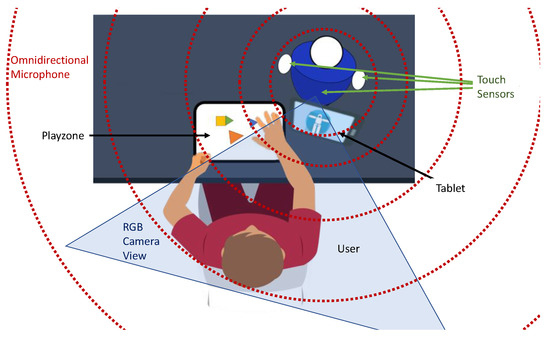 An illustration of the environmental setup of the case studies. We used the same colour coding as that in the 3D representation of the environment (blue for the camera, green for the touch sensors and red for the speaker).