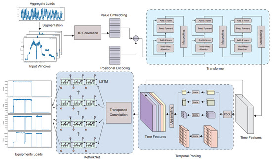 The main idea of the approach is to propose a deep learning network, TTRNet, whose inputs aggregate commercial load information and end-to-end directly outputs the subcommercial load sequences contained therein. The design of TTRNet is divided into three main steps. First, a deformer-based encoder is designed to enhance the extraction of time series features by invoking and improving the latest techniques in NLP. Secondly, a Temporal Pooling module is designed to pool features extracted from the encoder at different time scales, thus increasing the perceptual domain without affecting the temporal resolution of the output. Finally, a RethinkNet module is designed to utilize its unique rethinking process to learn relevance while achieving the final multi-label classification. The original Focal Loss is improved to adapt it to multi-label classification tasks and solve the load imbalance problem and improve the accuracy of challenging loads.