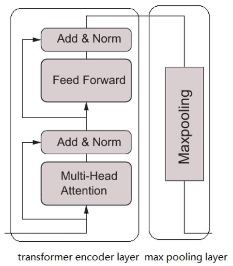 The Transformer part of TTRNet, i.e., the encoder part of TTRNet, is used to extract input features. This part uses the Transformer’s encoder structure. It consists of a stack of N identical modified encoder blocks, each of which includes a Transformer encoder layer and a max-pooling layer, whose structure is shown in Figure 2.