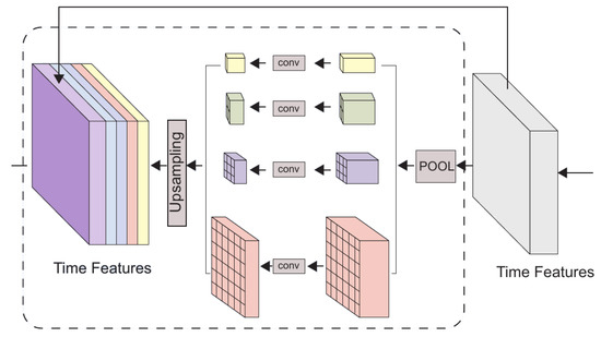 At the end of each of the four channels, linear upsampling is performed so that the output of the Temporal Pooling block has the same precise time resolution as the encoder output. Finally, the five channels are concatenated to form a new feature vector. The total number of features with contextual information is doubled compared to the number of features fed into the Temporal Pooling module.