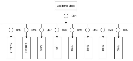 In this study, the above methods are experimented with using the Commercial Building Energy Dataset (COMBED) [8]. This dataset includes real-world data collected from smart meters deployed in different buildings and subsystems of IIITD. These real-world figures include total electricity consumption per building, high energy loads, and total electricity consumption per floor. The Academic Block can be thought of as a commercial building similar to an IT office. Like other commercial buildings, it mainly includes air conditioning load, lighting load, elevator load, etc. Since the air conditioning load is often used for demand response, this paper takes the air handling unit (AHU) of the Academic Block as the research object. AHU0, AHU1, AHU2, and AHU5 are four loads in different power consumption scenarios. The smart meter installation location of the Academic Block is shown in Figure 5, and the collected data information is shown in Table 2.