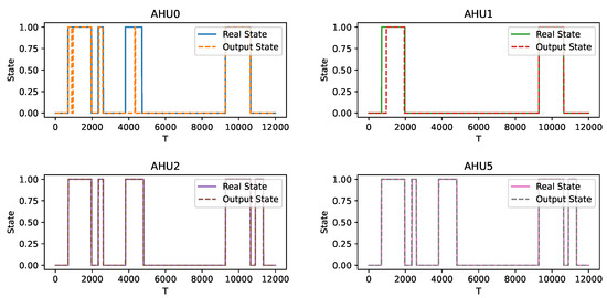 Then, the output states are compared with the real states, respectively. Figure 6 shows the identification of the states of the four AHUs in this scenario. It can be seen that there are errors in the identification of several activations of AHU0 and AHU1, while the identification of both AHU0 and AHU1 is perfect, which may be due to the large differences in the operation of AHU0 and AHU1. Overall, the method is effective in capturing the changes in the operating state of each AHU.