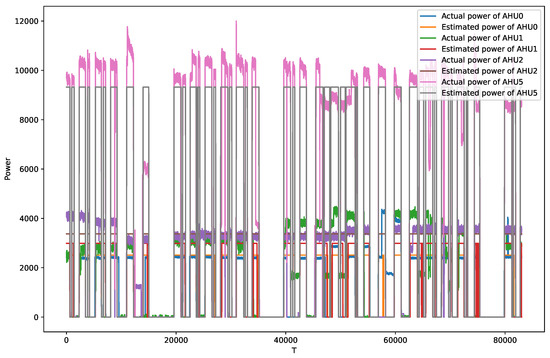 Twenty experiments were also conducted in the unseen scenario. Table 7 shows the method’s performance in identifying the state and estimating the instantaneous and total power consumption in this scenario. The average F1 score is 0.904, the average accuracy is 0.932, the average recall is 0.878, the average accuracy is 0.919, and the average MCC is 0.834. For estimating the transient power consumption, the average MAE of the four AHUs is 433.24. For estimating the total power consumption, the average SAE of the four AHUs is −0.058. With a guaranteed average F1 score of 0.904, the accuracy of AHU2 and AHU5 remain at 0.940 and 0.983, respectively, indicating that the method is still effective in identifying unseen scenarios.