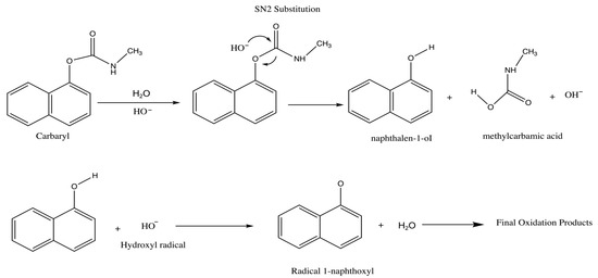 Enzyme-coupled materials have been frequently reported to increase the sensitivity and selectivity of electrochemical sensors for carbaryl detection. However, enzymatic-based assays are expensive and require a qualified scientist to use the instrument [10]. Moreover, enzymes employed as sensors require specific handling in terms of storage, temperature, enzyme activity, pH and applied potential, which makes these devices more complicated to deal with and less consistent in terms of reliability [11]. Recently, non-enzymatic methods have been reported which require the hydrolysis of carbaryl to carbaryl–phenol (Figure 1) to enhance the electrochemical reaction [12,13]. However, it was reported that carbamate residues can be detected directly, electrochemically, without the requirement for the target analytes to be first hydrolyzed [14,15,16]. The comparatively high detection potential required for these herbicides has a significant impact on sensitivity and selectivity. In previous studies, carbamate-hydrolyzed derivatives had a significantly lower oxidation potential and a favorable electrochemical performance, reducing interference and significantly increasing electrode efficiency.