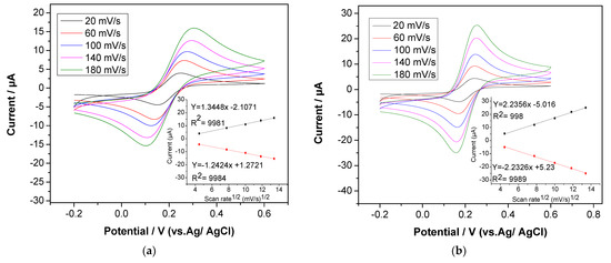 Cyclic voltammetry was also used to evaluate the reversibility and diffusion-controlled properties of the redox probe. For modified nanocomposite electrodes, plots of peak current vs. the square root of the scan rate are displayed in Figure 6a,b (inset). Based on these figures, the peak currents and the square root of the scan rate values indicate a perfect linear relationship, showing that the reversible electron transfer reaction is completely diffusion controlled. Moreover, to evaluate the sensitivity of detection, cyclic voltammetry was used to measure the modified nanocomposite sensor’s effective electroactive surface area using the Randles–Sevcik equation: