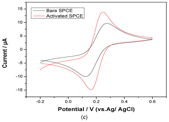 The surface of the screen-printed carbon electrode was activated to improve the electrode responses by cycling the electrode between 0 and 1.6 V in 0.5 M sulphuric acid at a 0.1 scan rate [42]. The CVs of the bare and activated electrodes are shown in Figure 2a,b. The electron transfer kinetics of the activated SPCE showed dramatic improvements. Moreover, a significant reduction in the separation between anodic and cathodic peak potential was reported for the treated electrode (from 186 mV to 145 mV, respectively), as well as a significant improvement in the current response from 9.83 µA to 14.97 µA at a 0.1 scan rate (Figure 2c). Obviously, it can be observed that there was a linear relationship between oxidation current and the square root of the scan rate, indicating that the reversible electron transfer reaction is a perfect, diffusion-controlled process, as seen in the Figure 2a,b insets. These enhancements can be attributed to increased surface hydrophilicity, an increase in the functional groups of carbon and oxygen on the surface and the elimination of surface contaminants [43,44]. Additionally, SEM images (Section 3.3) show the electrode surface morphology before and after electrochemical pre-treatments with 5000× magnification. The differences were obvious, as, when anodic polarization was applied in an acidic solution, the particles were slightly peeled off, and the surface of the electrode was changed to be dim, black and rough, which was more likely as a result of the elimination of organic binders [44,45].