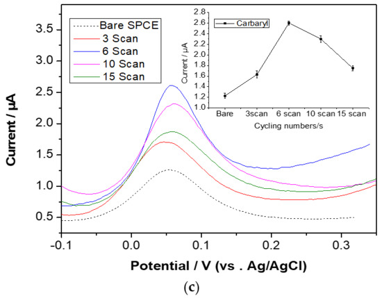 Additionally, the effect of cycling numbers on the reduction process on the carbaryl current response was investigated. Figure 3c illustrates that the oxidation peak current significantly improved when the cycling number increased from three to six scans. This is as a result of the majority of the surface area of the electrode, which was enhanced by the number of cycle reductions of the composite. However, the current was decreased by increasing the cycling number from 10 to 15 scans due to the size of AuNPs, which became larger and decreased the surface of the electrode [46]. Therefore, a 6-cycle of electro-reduction was selected for further optimisation.