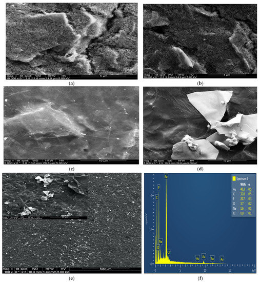 The surface morphology of the screen-printed carbon electrode was characterized using SEM. According to the SEM images in Figure 4a,b, the bare and activated electrodes showed non-uniform and heterogeneous graphite flakes of micrometric dimension separated from each other [47]. The graphene oxide nanosheets were accumulated on the electrode surface to form reduced graphene oxide, which appeared as typical, graphene-like sheet layers with wrinkles [48], as seen in Figure 4c. Simultaneously, the gold nanoparticles were then reduced on the reduced graphene oxide (rGO) nanosheets, presenting bright spheres distributed homogeneously onto the rGO sheets (Figure 4d) [49,50]. EDS analysis was also used to determine the elemental compositions, as shown in Figure 4f. The signal of O and F was attributed to Nafion, and C to rGO. The presence of AuNPs was confirmed by the signal of Au in the pattern. The elements of Na and Cl could be related to residual NaCl. Further analysis was performed using XPS to reveal information on the elemental composition and electronic state of the elements (Figure S1, Table S1).