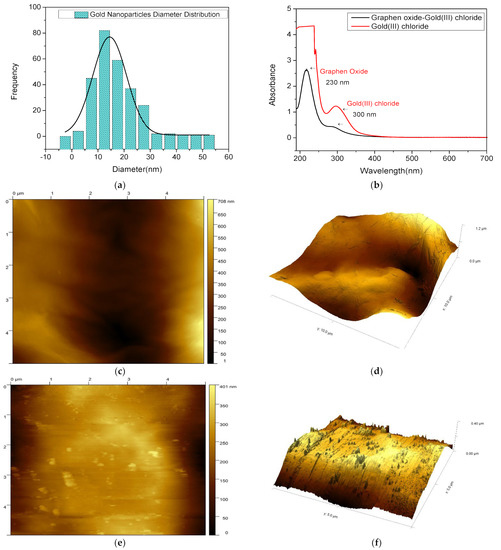 To further characterize the modified electrode, AFM measurement were performed, as seen in Figure 5. The morphology of the gold nanoparticles demonstrated in the AFM images is consistent with the SEM micrographs. Figure 5e shows round gold nanoparticles that are irregularly dispersed on the substrate. Figure 4c shows the wrinkles and thin grooves on the surface of reduced graphene oxide. The AFM three-dimensional image shows more apparent wavy features (Figure 4d). Figure 4e shows unordered gold nanoparticles on the surface of the reduced graphene oxide sheets. The three-dimensional image (Figure 4f) shows the clear morphology of nanocomposites. The UV–visible range was used to characterize the absorption spectrum of the nanomaterials. As shown in Figure 5b, gold (III) chloride had a strong absorption maximum at a wavelength of 300 nm. Graphene oxide had an absorption peak centered at 230 nm.