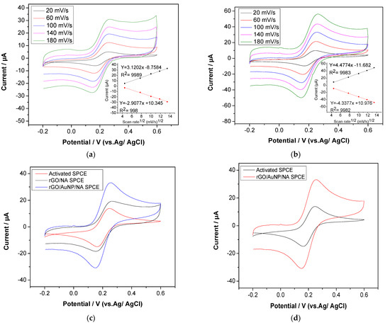 Cyclic voltammograms and plots of peak current vs. square root of scan rate (inset) for rGO/NA SPCE (a) and rGO/AuNP/NA SPCE (b) with various scan rates from 20 mV/s to 180 mV/s. (c) Cyclic voltammograms of activated, rGO/NA and rGO/AuNP/NA SPCEs at 0.1 scan rate. (d) Cyclic voltammograms of activated and rGO/AuNP/NA SPCEs at 0.1 scan rate: in 1 mM K3[F (CN)6] in 0.1 M of KCl.