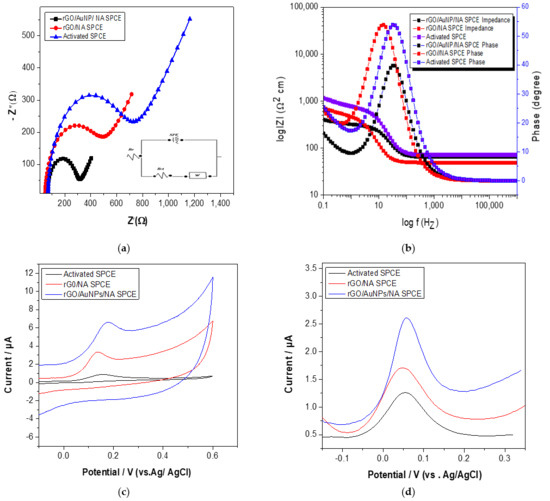 Nyquist plots (a,b) bode plots of EIS for activated SPCE, rGO/NA SPCE and rGO/AuNP/NA SPCE using 1 mM K3[Fe(CN)6] in 0.1 M of KCl. Cyclic voltammograms (c) and DPV (d) of 200 µM carbaryl in 0.1 M acetate buffer (pH = 5) at activated SPCE, rGO/NA SPCE and rGO/AuNP/NA SPCE.