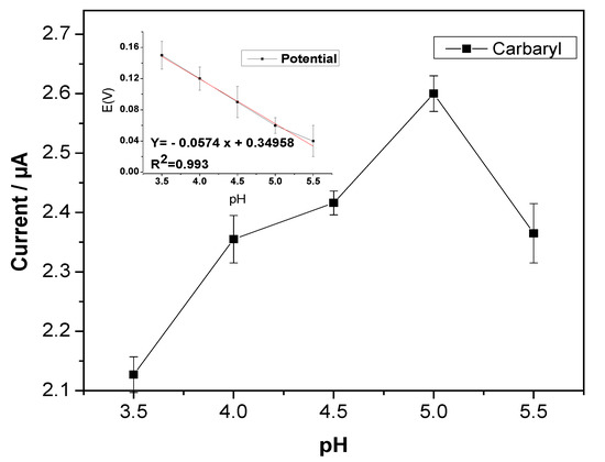 The influence of pH on the peak potential and current of carbaryl is significant. Therefore, the electrochemical performance of carbaryl was investigated in acetate buffer within a pH ranging from 3 to 5.5. According to Figure 8, with increasing pH, the potential moved to more negative values, indicating the linear relationship between pH and- current potential. Additionally, the equation was determined to be Ep/V = 3.4958 − 0.0574 pH with an R value equal to 0.0993, and the slope was 57 mv pH per unit, which was nearly equal to the theorical value (59 mv) as per Nernst’s theoretical equation. As a result, the carbaryl oxidation process involved an equal number of protons and electrons. It was obvious that, at a pH of 5, the current achieved its highest value and then tended to decline, which could be due to the molecule protonation and the production of naphthoxide species [14,51]. pH 5 was selected as the effective pH for the following research.