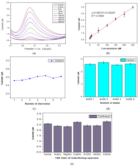 Under optimum conditions, DPV was used to determine carbaryl–phenol concentrations ranging from 0.5 µM to 250 µM. Figure 9a shows the resulting voltammograms with various carbaryl–phenol concentrations. The peak currents obviously increased with the increasing concentrations, indicating very good linearity with a correlation coefficient of 0.9989 (Figure 9b). The calibration equation of carbaryl was y = 0.0094X + 0.663 with a sensitivity of 0.01 µA/µM. The limit of detection and quantification was estimated to be 0.2 and 3.5, respectively. The reproducibility of the modified, screen-printed carbon electrode was evaluated using seven electrodes, which were prepared in the same manner. The relative standard deviation (RSD) of 200 µM carbaryl was 1.7%, indicating a very high degree of reproducibility (Figure 9c). Additionally, the developed electrode stability was studied, and it was discovered that the electrode could be used for a month with a slight decrease in the carbaryl oxidation peak current under the ideal condition (Figure 9d). Furthermore, under the optimized conditions, the interference study was investigated in the presence of a variety of possible interfering species in 0.1M acetic buffer containing 200 µM carbaryl. The 100-fold Ca2+, Mg2+, Na+, Zn2+, Cd2+ and Al3+ did not significantly affect the determination of carbaryl. It was observed that the effect of these species on the oxidation current of carbaryl was approximately 10% (Figure 9e). The DPV of carbaryl–phenol in the presence of interfering ions is shown in Figure S3.