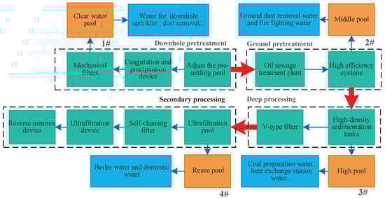 The traditional reuse system of mine water treatment is relatively simple- being processed by all the treatment systems and then reused. The water quality testing indicates that the mine water can meet the water quality needs for the underground fire, grouting, hydraulic support, cooling, and underground dust removal after being treated by clear pool; it can meet the water quality needs for the ground dust removal and fire fighting after being treated by the intermediate pool; it can meet the water quality needs for the coal preparation, heat exchange station, cooling, green and other utility after being treated by high-level pool. Therefore, in the stages of pretreatment, secondary treatment and deep treatment, reuse outlets need to be set respectively to meet the water quality and quantity requirements in different water use points. The specific settings are as follows: there are four levels of water supply points, according to the grade of the rise are: clear water pool, intermediate pool, high-level pool, reuse pool, according to the mine water quality coupling relationship, the water in the clear water pool can be used for underground fire fighting, grouting, hydraulic support, cooling, and underground dust removal; the water in the intermediate pool can be used for ground dust removal and fire fighting, the water in the high-level pools can be used for coal preparation, heat exchange station, cooling, green, and other domestic use; the water in the multiple-use pool can be used for: domestic drinking and boiling, of which the water quality requirements of higher-grade water supply points can meet the water demand of lower-grade water points. Figure 1 below shows the improved mine water supply method. As shown as Figure 1, it shows the improved mine water supply method for the above description, and the numbers “1#–4#” indicate the node pools for scheduling.In addition, the blue part indicates where the water is used, and the cyan part indicates the pool in the water treatment process.