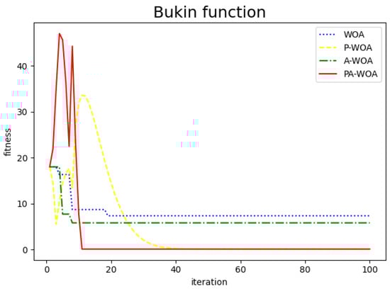 To better compare the improved effect, compare the P-WAO and PA-WAO functions that can achieve the optimal optimization value. The improved P-WAO and PA-WAO in the Bukin function, Ackley function, and Restriqin function can find the optimal value, but the local convergence speed of PA-WAO is significantly better than that of P-WAO, which can be analyzed from the number of iterations. As in the 100 test process, the number of iterations of P-WAO and PA-WAO to find the optimal value of the Reaction function was 11 and 26 times, the number of iterations to find the optimal value of the Bukin function was 11 and 28 times, the number of iterations to find the optimal value of the Ackley function was 7 and 55 times, and the number of iterations to find the optimal value of the Sphere function was 4 and 11 times, respectively. At the same time, in the test of the Sphere function, PA-WAO can find the optimal value every time, but the optimal value found by P-WAO is on average , which is slightly worse than the optimization ability of PA-WAO.