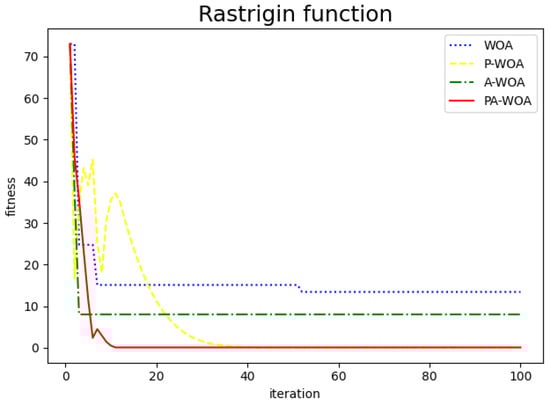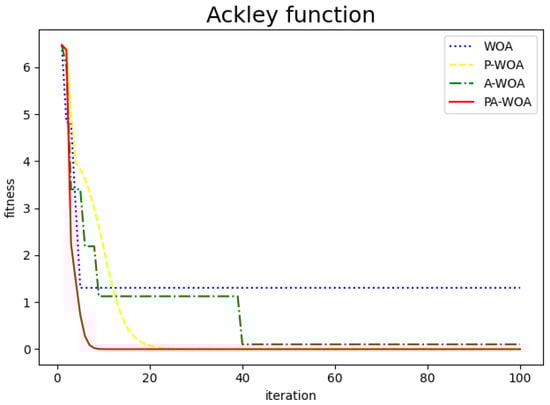 The comparison chart of the effect before and after the improvement of the Whale Optimization Algorithm is as follows, where the blue dotted line represents the original Whale Optimization Algorithm (WAO), the yellow dotted line represents the Whale Optimization Algorithm (P-WAO) after the introduction of particle swarms, the green dotted line is the Whale Optimization Algorithm (A-WAO) that has been improved with adjustment of its own parameters of the Whale Optimization Algorithm, and the red line is the Whale Optimization Algorithm (PA-WAO) that is improved by combining the two ways. As shown in Figure 3, Figure 4, Figure 5 and Figure 6.