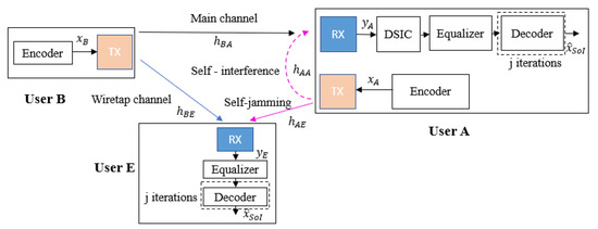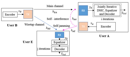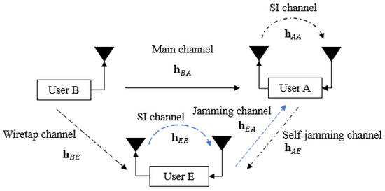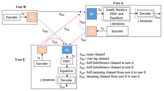 - Both user A and user E have equal computation capabilities, and the location of user E is close enough to user A to broadcast its jamming signal as well as to be attacked by the self-jamming signal from user A;