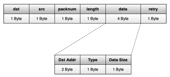 The RTS packet structure, depicted in Figure 1, is based on the one defined by the SX1272 LoRa module support library and used in [18]. In this structure, 5 bytes are the minimum packet header, and the remaining 4 bytes are for data payload, used directly by the EDs. Of these, 2 bytes are reserved for the address of the GWs that might receive the advertised packet, 1 byte for the type of packet transmitted (control, in this case), and 1 byte for the size of the advertised packet.