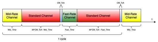 As in the LoRa networks all the devices have to respect the duty-cycle restriction, the GWs have to change their operation channels accordingly. Hence, they have to wait for ninety-nine times the ToA of a CM packet between transitions to non-Standard channels. During that period, the GWs hop back to the Standard channel without further advertisement, upon the end of the non-Standard time advertised by a CM packet. As soon as the duty-cycle restriction ceases, a GW can change again to a non-Standard channel. GWs do not change to the same non-Standard channel consecutively; they alternate between Mid-Rate and Fast-Rate. Therefore, if a GW hops from the Standard to Mid-Rate channel in a first instance, in the next hop to a non-Standard channel it will chose the Fast-Rate channel, and vice versa. The GW channel hopping cycle is shown in Figure 2.