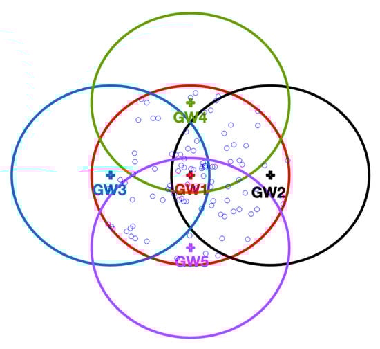 For each performance test, the number of EDs varied between 100 and 2000. The circumferences centered in each one of the GWs represent the maximum communication reach of each available channel. Moreover, the times allocated for the Fast-Rate and Mid-rate channels, per cycle, were 7.5 and 10 s, respectively.