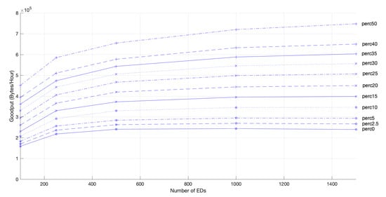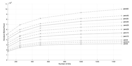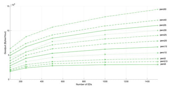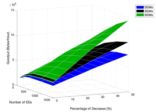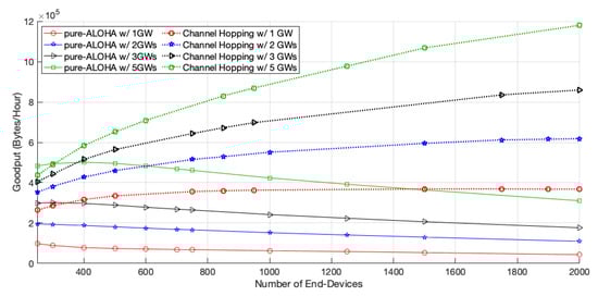 Figure 4 shows the network goodput for both access protocols, for different network sizes and scenarios. With the addition of more GWs, the goodput of pure-ALOHA improves, as a higher number of EDs have a better chance to transmit their packets successfully, namely, those which are furthest from GW1. However, our scheme, when compared with the pure-ALOHA access scheme in a network of 2000 EDs, further improved the goodput by % with the installation of a second gateway (GW2), % upon including a third one (GW3), and % when five GWs were considered.