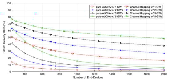 As for the channel hopping protocol, the network goodput also increases with the number of GWs. This time, the increase is more pronounced than with pure-ALOHA, as the EDs can use faster channels to transmit, and thus have more opportunities to access the medium. Moreover, as the competition to access the medium of each GW is lower, there is a better chance for the transmissions to be successful, which leads to an increase in the PDR, as shown in Figure 5. For a network size of 2000 EDs, the goodput of channel hopping increases by %, %, or %, with two, three, and five GWs, respectively, when adding GWs to the network.