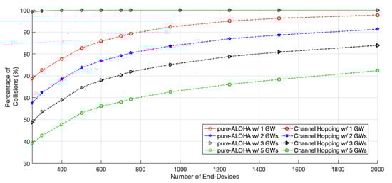 Regarding the collision percentage, illustrated in Figure 6, we can see that for pure-ALOHA this value is close to 100% no matter the number of gateways in the network; this is justified by the high number of EDs in the experiments, leading to a network saturation scenario. With our scheme, the percentage of collision increases with the network size. For 2000 EDs, it ranges from 72% with five GWs up to 97% with only one GW. Nevertheless, in spite of the high percentage values observed in both schemes, the network goodput is not equal to zero, thanks to the non-destructive property of LoRa.