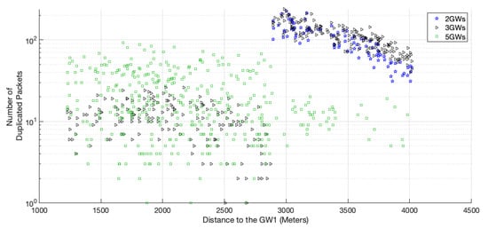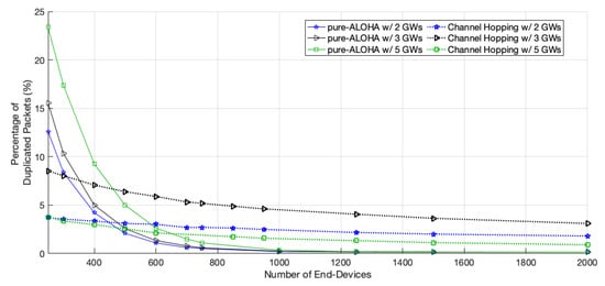 The percentage of duplicate packets, i.e., packets received simultaneously by more than a single GW, increases with the number of GWs, for networks with less than approximately 1000 EDs, as seen in Figure 7. From this density up, the percentages are very similar for the networks with different sizes.
