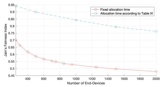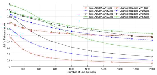 As shown in Figure 8, the Jain’s network fairness of pure-ALOHA improves with the introduction of new GWs, as there is a better chance for the EDs, namely, those further from GW1, to have a better signal strength to a given GW. As the network increases, the number of collisions also increases, and the EDs with better signal quality have higher chances to deliver their packets. Therefore, the fairness decreases, regardless of the introduction of GWs to the network.