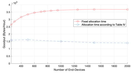 Figure 10 illustrates the Jain’s network fairness according to the channel allocation times presented in Table 4, where we can see that by using a customized time channel allocation time, according to the number of EDs in the network, the protocol is considerably fair when compared to a blindsided version of it, with a fixed allocation time. In particular, for a network of 2000 EDs, the network fairness index increased from to . As explained before, by using a fair channel allocation time we are reducing the channel time allocated to the fastest channel because the data rate is higher, thereby granting the same channel access opportunities to EDs in other zones. Naturally, such a reduction has an impact on the network goodput, as illustrated in Figure 11, because EDs in faster zones are the ones that contribute more to the network goodput.