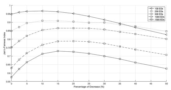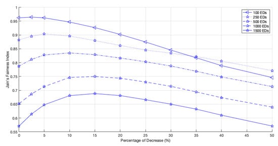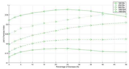 The interception between the curves of 100 EDs and 250 EDs happened for a higher PoD, approximately 44%, as shown in Figure 16. Furthermore, PoD above 40% had a more negligible influence on the fairness of networks with 1500 EDs. Like the networks with three GWs, the fairness peak does not always increase with the network growth; it starts to decrease above about 500 EDs.