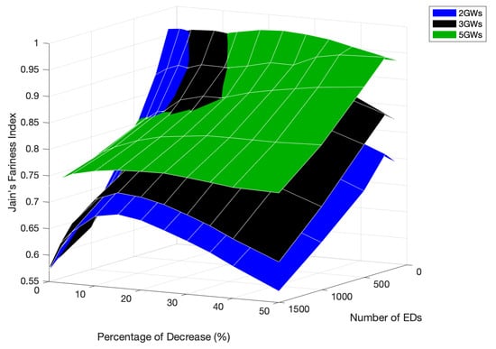 When the scenario with five GWs had 1500 EDs, the fairness peak was at , as the PoD was equal to 25%. For the same PoD and network size, the fairness values verified for the other scenarios were and , for two GWs and three GWs, respectively. This is a clear difference, which is as marked as the time allocated to faster rate channels, per GW cycle.