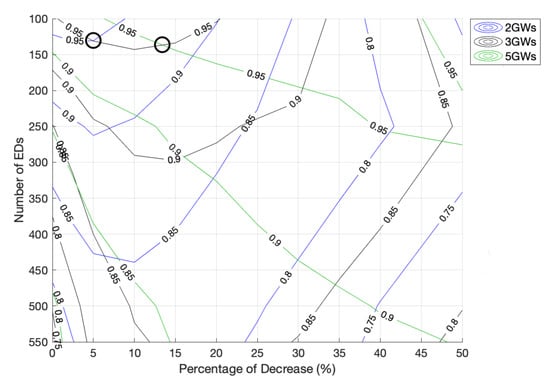 The results also show an overlap between the three tested scenarios. First, the scenario with two GWs achieved better fairness than the others, followed by the network with three GWs. and last, the one with five GWs. This behavior is supported by Figure 19, in which the curve representing the 0.95 fairness index moves towards higher PoD as the number of GWs increases. As seen, for a network with 100 EDs, the higher fairness achieved with the original time allocation occurred with a scenario with two GWs. However, as the number of EDs increased, better fairness was guaranteed by the scenario with three GWs when the PoD was around 5%. Then, above a PoD of about 13.4%, as the 0.95 fairness lines of three and five GWs intersect, the fairness of the latter scenario became the best.