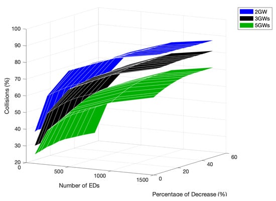 Figure 21 illustrates the percentage of collision for every tested scenario. The network with five GWs had the lowest number of channel access collisions when considering every medium access performed by the EDs. As referred to before, the main reason for this behavior is the reduction in the number of EDs sharing the channel and the lower probability of two or more EDs choosing the same time slot to transmit. Another reason is the decreasing possibility of the hidden-terminal problem. As the number of GWs increases, the EDs transmitting to a given GW, with a specific channel, are more within reach of the other EDs that also transmit to the same GW. Thus, the control packets are more likely to be received by the generality of the EDs, decreasing the number of situations where two EDs transmit at the same time because none of them receive the control packet sent by the other.