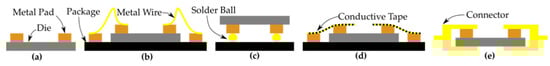 Packaging methods: (a) no packaging, (b) wire bonding, (c) flip-chip bonding, (d) tape-automated bonding, and (e) built-in packaging.