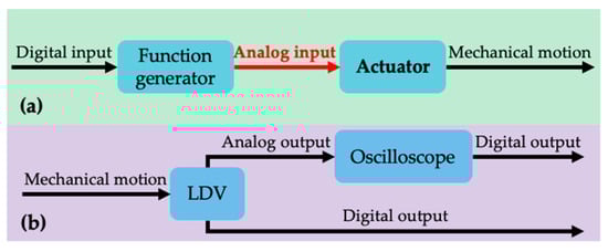 Schematics of the (a) actuation, and (b) characterization strategies. The red color indicates the focus of this study while the bold text indicates elements fabricated in the scope of this work. LDV stands for laser Doppler vibrometer.