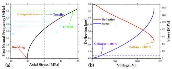 The residual stress gets affected by so many parameters such as growth temperature and rate [], material, deposition method, thickness [], epitaxial mismatch [], surface roughness, and contact angle []. Therefore, it is not feasible to make an accurate prediction by a simple calculation. Instead, a reasonable range, ±20 MPa, was defined based on the literature data [,,], and the simulations were run in this region. The length and thickness were determined by keeping the first natural frequency below 1.5 MHz. The relationship between the residual stress and the first natural frequency of the finalized design is shown in Figure 3a. It should be noted that compressive stress larger than 10 MPa might cause buckling during the release step, which is not desired. Additionally, buckling stress determines the thermal budget to calculate temperature limits. Fortunately, the first natural frequency of the fabricated structure is obtained at 1.4 MHz, corresponding to tensile stress around 17 MPa.