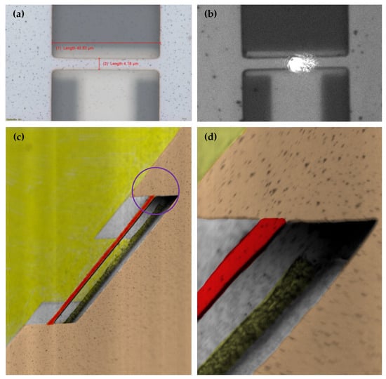 Fabricated resonator images from the following: (a) 100× optical microscope, (b) 50× optical microscope of the LDV with the laser spot, (c) 2000× SEM, and (d) 8000× SEM zoomed showing the purple area circled in (c). (Yellow: Actuation electrode; Brown: Ground electrode; Red: Resonator; Gray: Substrate).