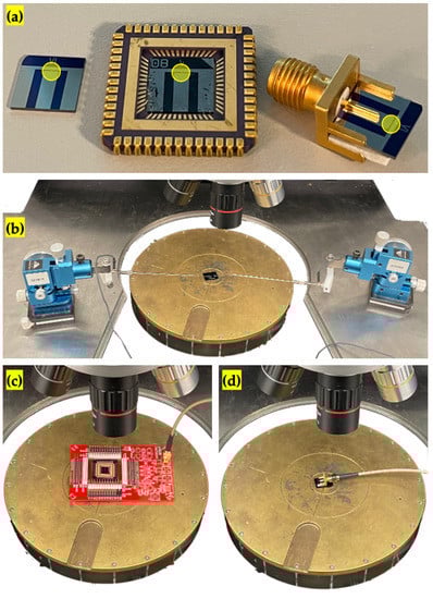 The die was fixed to the chip carrier with double-sided tape and wire-bonded with 25 um Al wire using a semi-automatic wedge–wedge bonder (Westbond 4546E), as shown in the middle of Figure 6a. Then, the chip carrier was mounted on a custom PCB connecting the chip carrier to the testing equipment, and an image from the experimental setup is shown in Figure 6c.