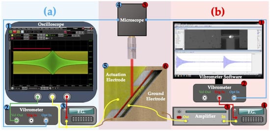 Experimental setup of (a) frequency sweep, and (b) pulse response analysis shown with blue and red backgrounds, respectively. Equipment configuration in frequency sweep analysis, (a), is 1: Oscilloscope, 2: Vibrometer, 3: F.G. (Function Generator), 4: Microscope, and 5: Resonator, while in pulse response analysis, (b), the configuration is 1: LDV software, 2: LDV, 3: Amplifier, 4: F.G., 5: Microscope, and 6: Resonator. Optical, velocity, actuation, ground, and trigger signals are shown with blue, green, yellow, brown, and red, respectively.