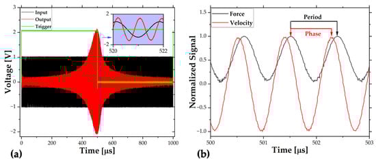 The data read from the oscilloscope is shown in Figure 8a. Both the actuation and velocity signals were in the time domain and, firstly, transformed into the frequency domain. Then, the root mean square of the velocity with respect to the actuation frequency was obtained and plotted in the following section to obtain the Q-factor and resonance frequencies. Finally, the phase difference between the force and velocity was obtained in the frequency domain to phase behavior and obtain the Q-factor. The phase difference in the time domain is shown in Figure 8b. The calculations related to this part are illustrated in the Supplementary Materials.