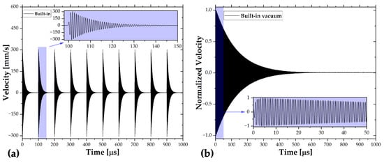 In the vacuum tests, the vacuum level was around 7 mTorr. Unfortunately, the laser beam struggled to focus on the beam, due to additional watch glass between the microscope and the resonator. Although the relative velocity in the time domain was stable, the magnitude was dependent significantly on the focus; therefore, it was normalized to prevent any calibration error.