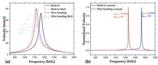 The pulse response results are shown in Figure 11a. Again, the horizontal axis is the actuation frequency domain, while the vertical axis represents the RMS velocity. The resonance frequencies, , are determined from the peaks of RMS velocity curves. Then, the quality factor from RMS velocity, , is found by the bandwidth, , as illustrated in Equation (5).